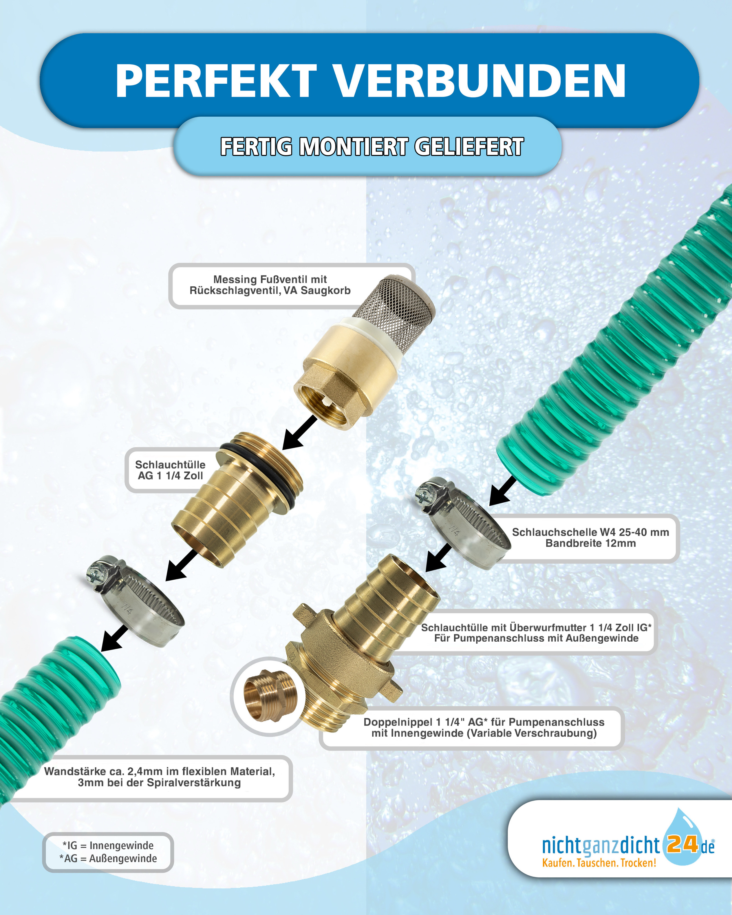 💧 Setzen Sie auf Qualität und Langlebigkeit – mit unserer Saugschlauchgarnitur 1 1/4 Zoll bekommen Sie ein langlebiges und robustes Anschluss-Set für Ihre Wasserpumpe oder Ihr Hauswasserwerk.